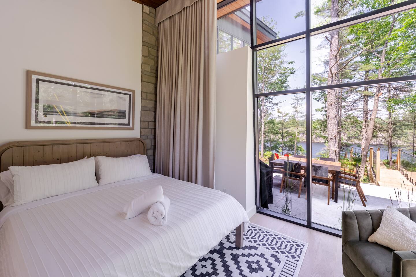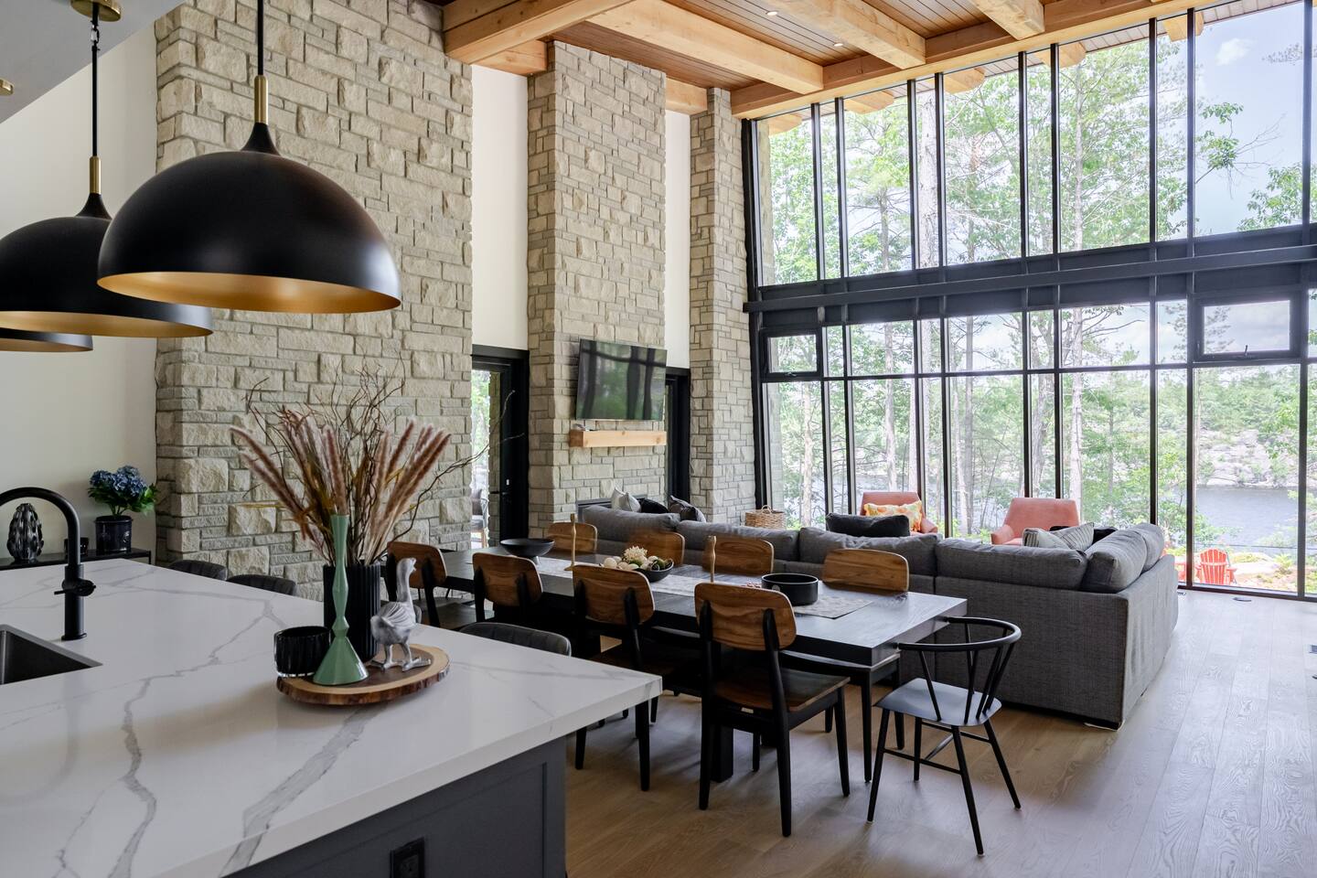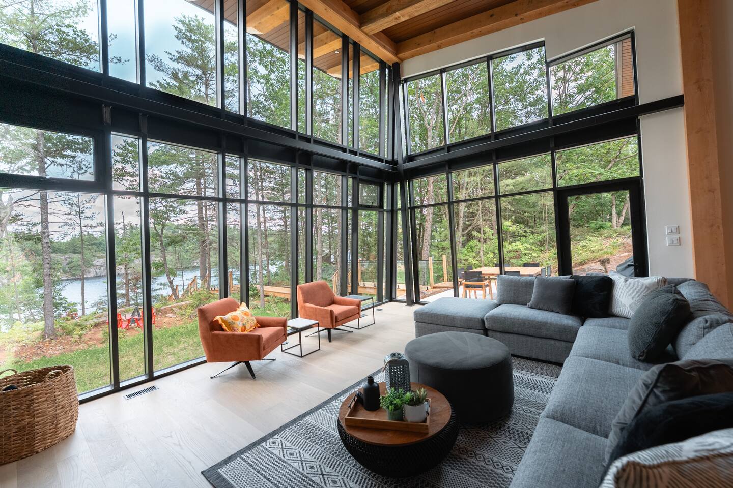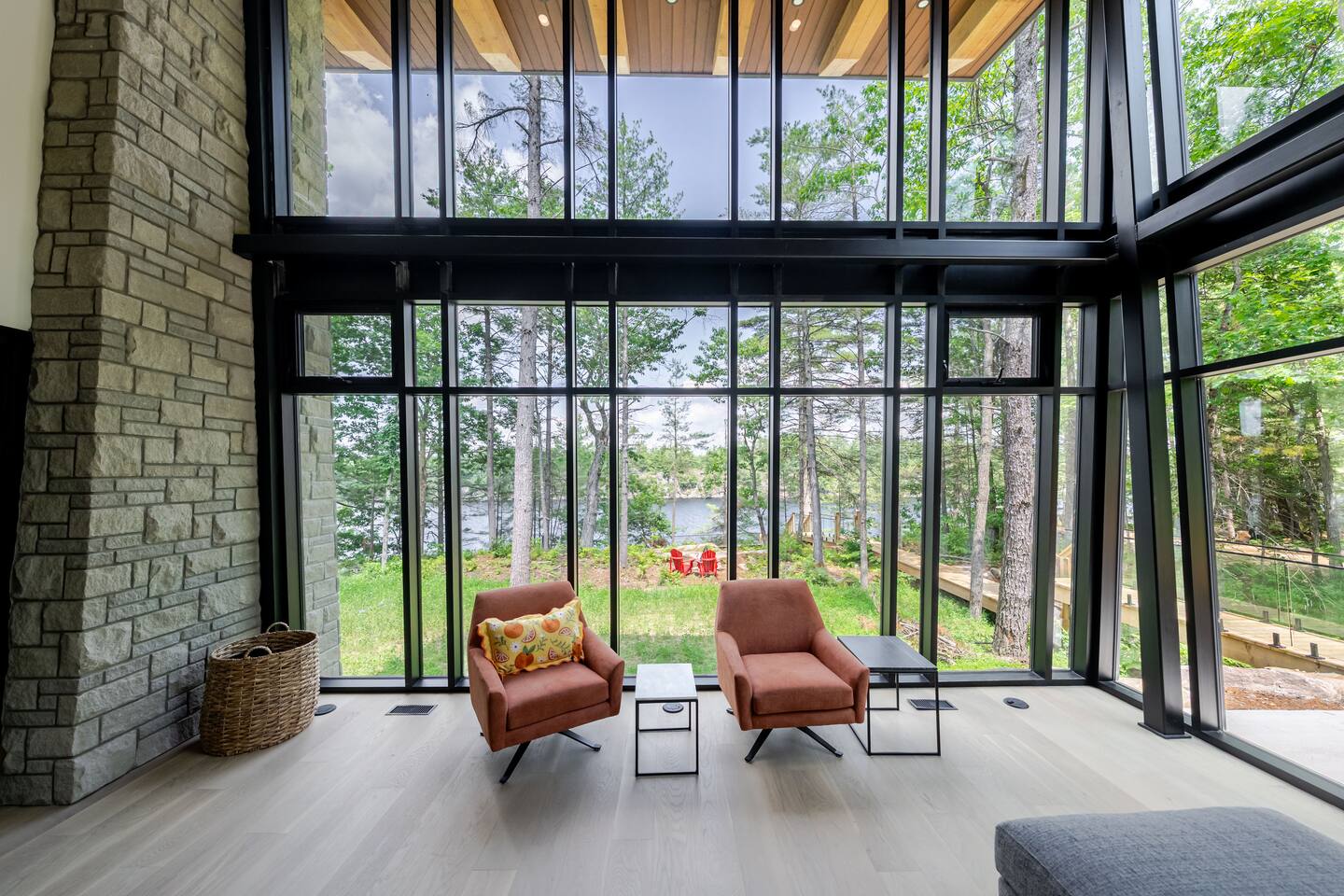 Escape to two stunning, side-by-side luxury cottages on the shores of Muldrew Lake — the ultimate setup for elevated family gatherings, corporate retreats, or special events in Muskoka. Each custom-built, 6-bedroom waterfront cottage offers its own private hot tub, fire pit, and direct lake access — giving you the rare option to book both properties together for large groups, or separately for more intimate getaways. Combined, the cottages sleep up to 24 guests, with over 9,000 sq ft of total living space designed for comfort, privacy, and connection. Located just minutes from Gravenhurst, these four-season retreats blend modern design with serene natural surroundings — perfect for slowing down, recharging, or bringing people together in a setting that feels both luxurious and grounded. PROPERTY HIGHLIGHTS (PER COTTAGE) 6 spacious bedrooms (each) 3 king bedrooms, 1 twin/single rooms, 1 flex/office with 1 single bed Chef’s kitchen with modern appliances, wine fridge, cooking essentials, and both a drip coffee and a Nespresso Vertuo Cups machine. Cozy grand room with soaring windows and fireplace Basement lounge with games area, extra beds, and smart TV ENSUITE INFORMATION 2 master bedrooms on the main floor, each with a full ensuite bathroom, plus a half bathroom in the common area. 2 bedrooms on the second floor share a shower, with individual toilets and sinks. Basement: 1 full bathroom. OUTDOOR AMENITIES (PER COTTAGE) Private hot tub overlooking the lake Fire pit area for late-night conversations under the stars. Please remember to bring your own firewood Expansive deck for yoga, dining, or sunset cocktails Lakefront access with kayaks, floaties, and life jackets included Ample space to relax, reconnect, or celebrate under the trees Whether you’re planning a multi-family getaway, a wellness retreat, or a team offsite, these cottages offer the rare balance of togetherness and privacy — with every detail designed to help you slow down and stay comfortably.