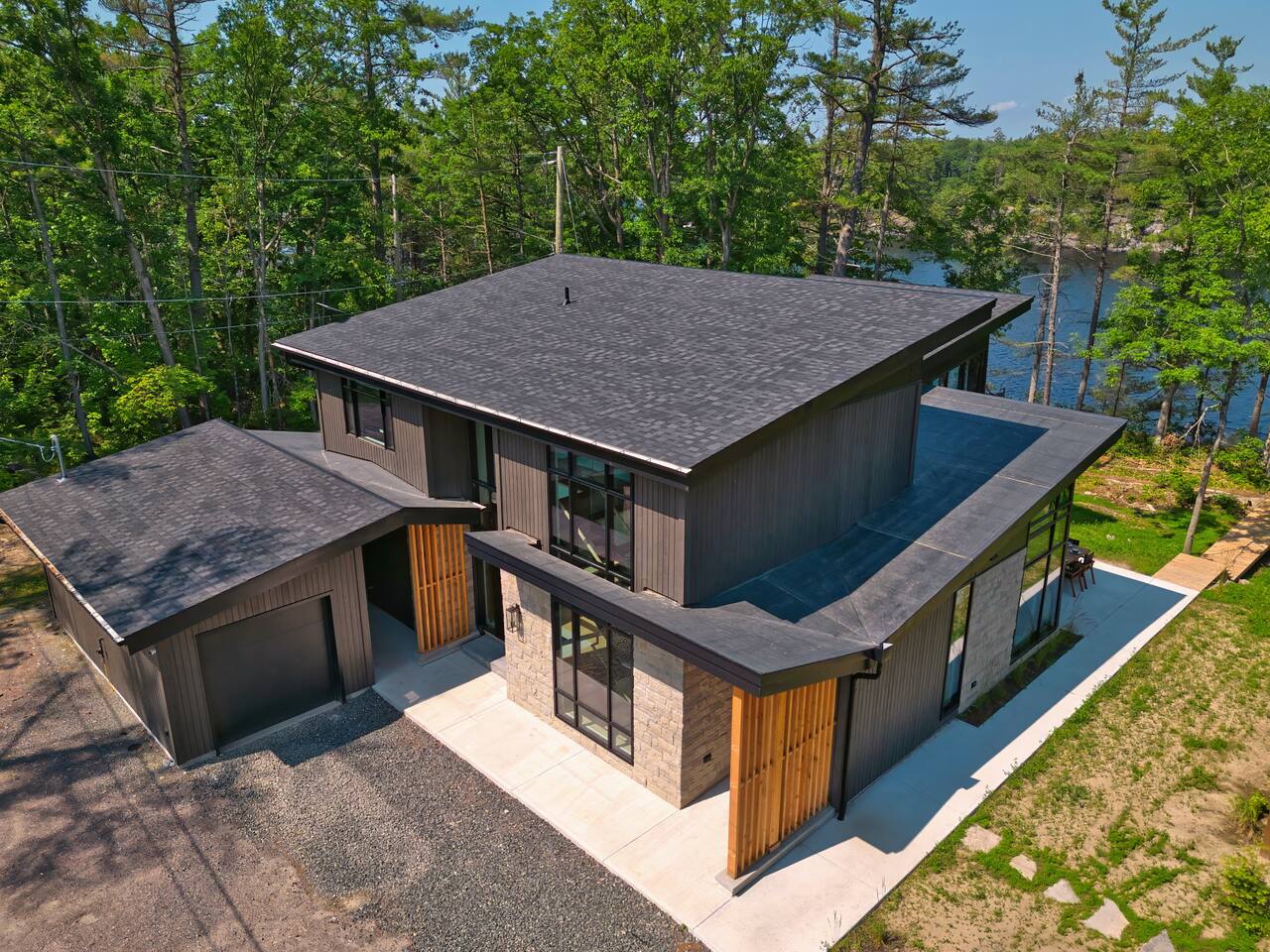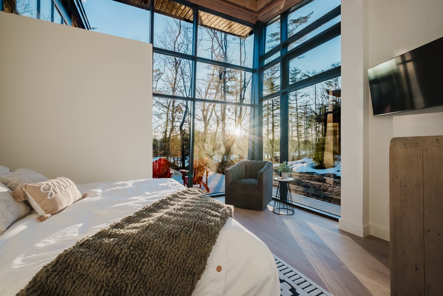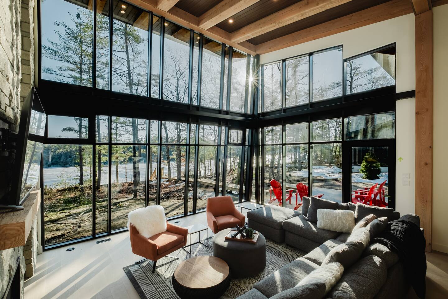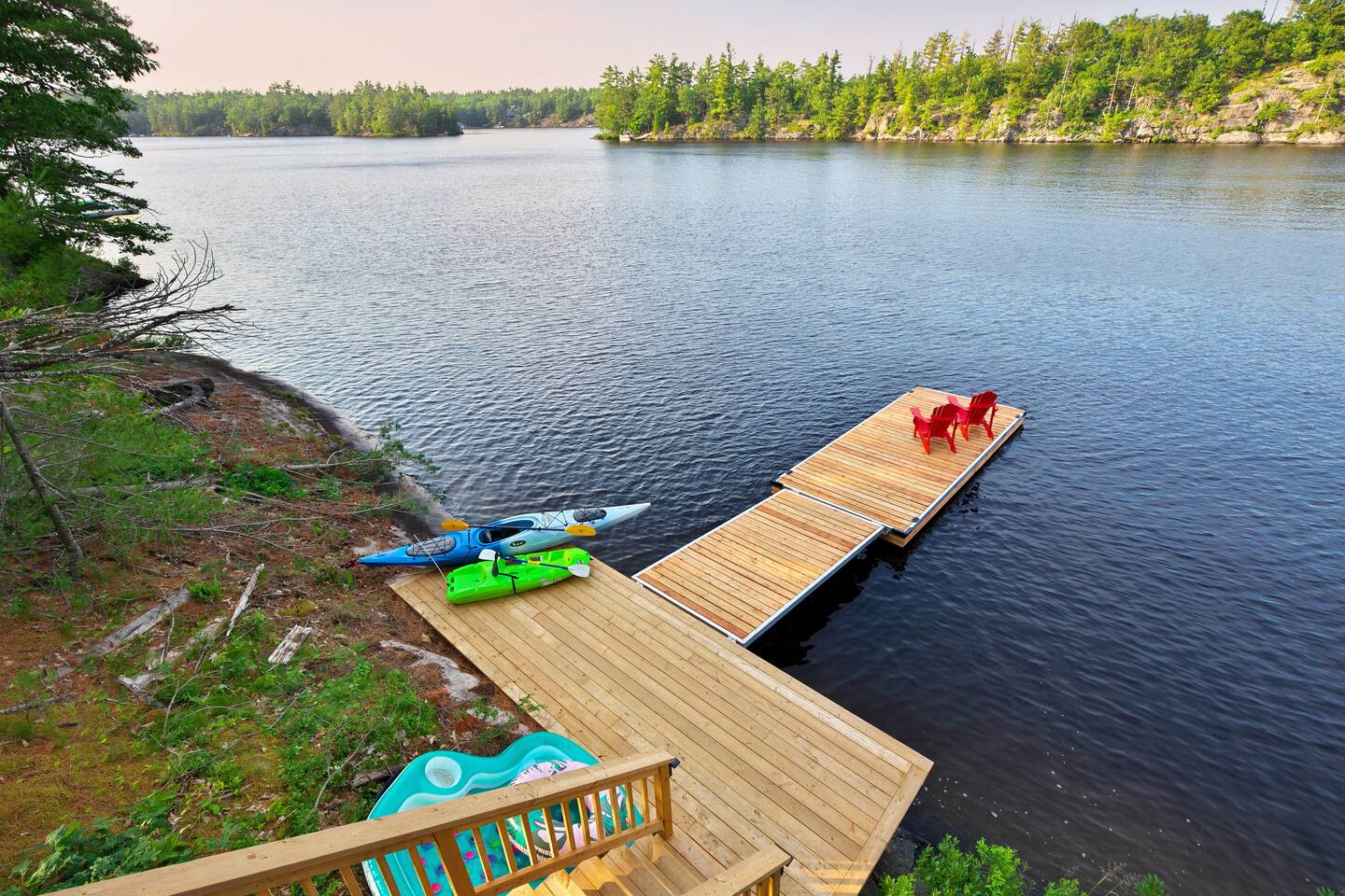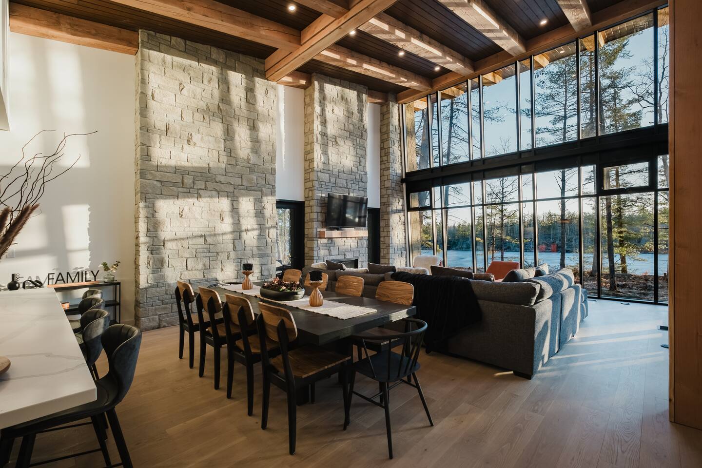Escape to our stunning, newly built Muskoka waterfront cottage on Muldrew Lake—perfect for family vacations, group getaways, or corporate retreats. With 6 bedrooms and room for up to 12 guests, this spacious and stylish four-season retreat offers comfort, privacy, and all the amenities you need for a memorable stay in the heart of cottage country. Located near Gravenhurst, this 4,600+ sq ft home is perfectly designed to host large groups while still offering cozy spots for quiet relaxation. Plus, with a second custom-built cottage next door (also available to book separately or together!), it’s an ideal setup for multi-family gatherings or corporate retreats—with the added benefit of privacy for each group. Main floor Open concept Kitchen + powder room + dinning room + family room + Muskoka room with TV + 2 full size King Bedrooms each with a full ensuite bathroom + garage Second Floor 1 Bedroom with 2 Single beds + 1 King bedroom - share a shower with individual toilets and sinks. 1 Bedroom with Single Bed + Desk Basement / Game Room Spacious open area featuring a large sofa and TV, plus a full bathroom and two separate rooms: one with a sofa bed ( ideal for children) and games, and the other with a yoga mat. LIVING SPACES Grand room with soaring windows, cozy fireplace, and sweeping lake views Chef’s kitchen with modern appliances, wine fridge, cooking essentials, and both a drip coffee and a Nespresso Vertuo Cups machine. Dining area for shared meals and gatherings OUTDOORS Panoramic observation deck—perfect for yoga, morning coffee, or evening drinks Direct lake access for swimming, kayaking, or lounging on floaties Kayaks, life jackets, and floaties included Fire pit area for late-night conversations under the stars. Please remember to bring your own firewood Whether you’re planning a family trip to Muskoka or hosting a corporate team retreat, this lakeside home has the space, style, and amenities to make it unforgettable.